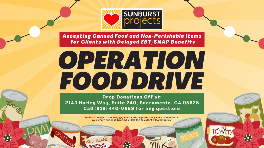 This year, Sunburst Projects is also launching Operation Food Drive to help support our clients experiencing delays with EBT/SNAP benefits. We are collecting canned and non-perishable foods to ensure no one goes without this season. Drop off donations at our office during business hours (Monday-Friday from 8am-6pm) located at 2143 Hurley Way, Suite 240, Sacramento CA 95825. Every item makes a difference!*